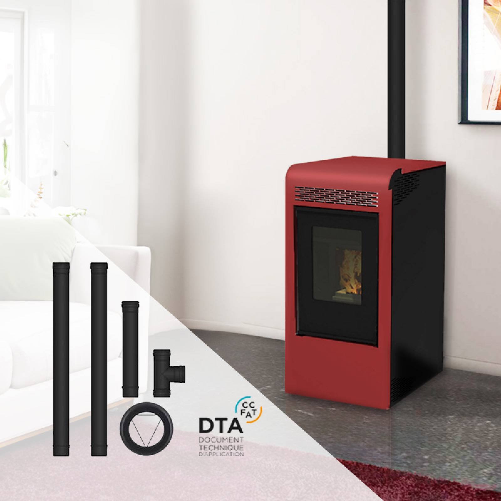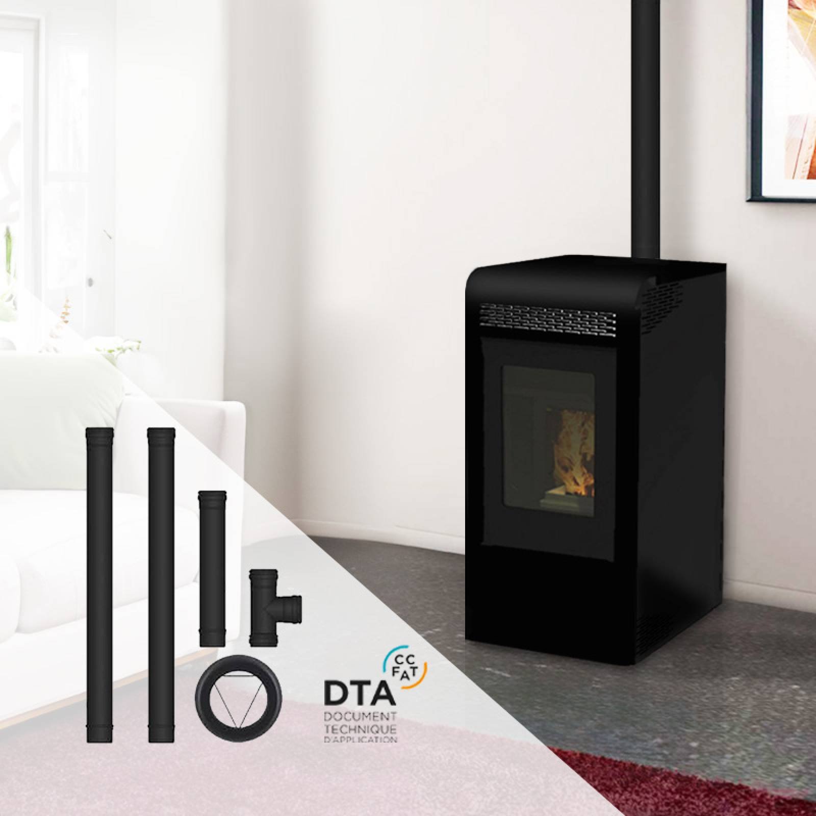 Une installation sûre et simplifiéeCe pack, adapté pour un poêle installé en sortie arrière, est composé des éléments suivants :