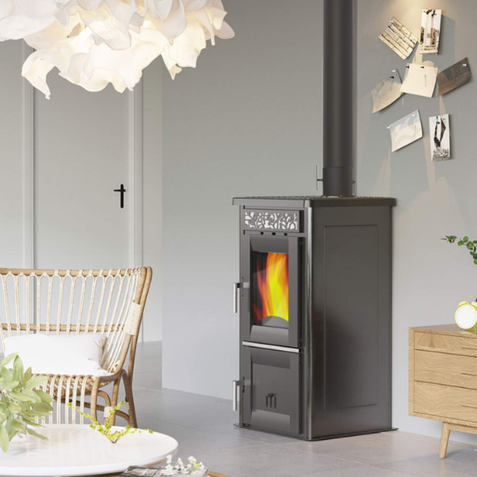 Disponible en coloris rouge ou anthracite, le poêle à bois Amelia se fond parfaitement dans tout type de décoration intérieure. Performant, ce modèle apporte aussi une touche d’originalité à votre décoration avec ses motifs raffinés sur l’avant.